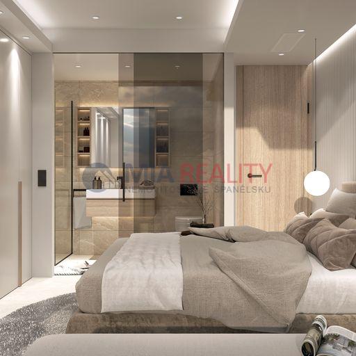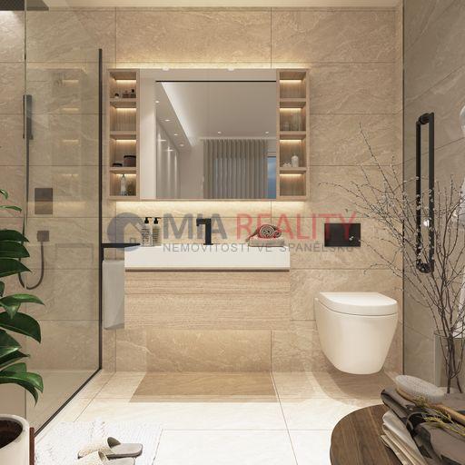 Apartmány mají 2 ložnice, obě s vestavěnými skříněmi a hlavní s vlastní koupelnou, 2 koupelny, otevřenou kuchyň s bílým zbožím, obývací pokoj s jídelnou a velkou terasu a soukromým solárem o rozloze 69 m².