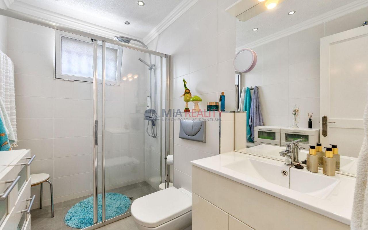 Horní patro zahrnuje další ložnici s vlastní koupelnou a prostornou terasu se soláriem (částečně krytá), nabízející soukromí a příjemný výhled.