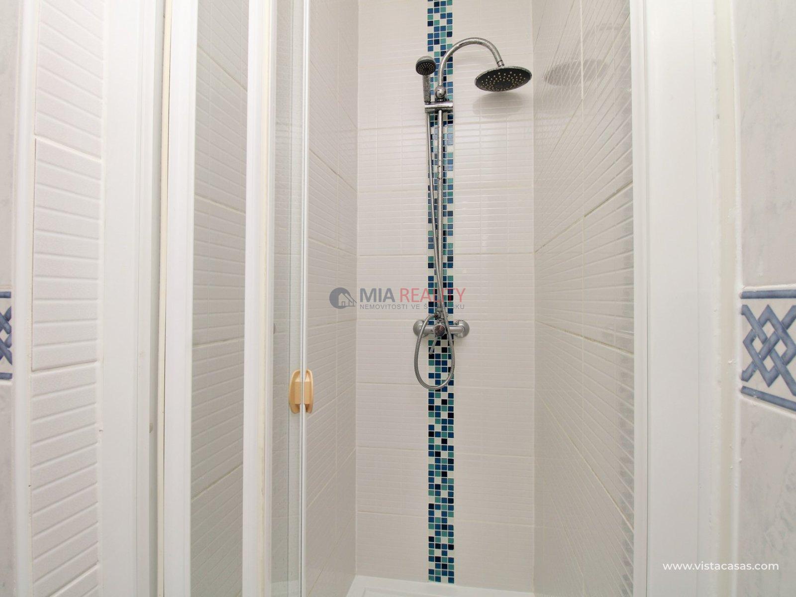 Obytná plocha má slunnou přední terasu vedoucí do prosvětleného salonku s jídelní částí, plně vybavenou kuchyň a WC pro hosty. Z kuchyně je přímý přístup na zadní terasu, která navazuje na společný bazén.