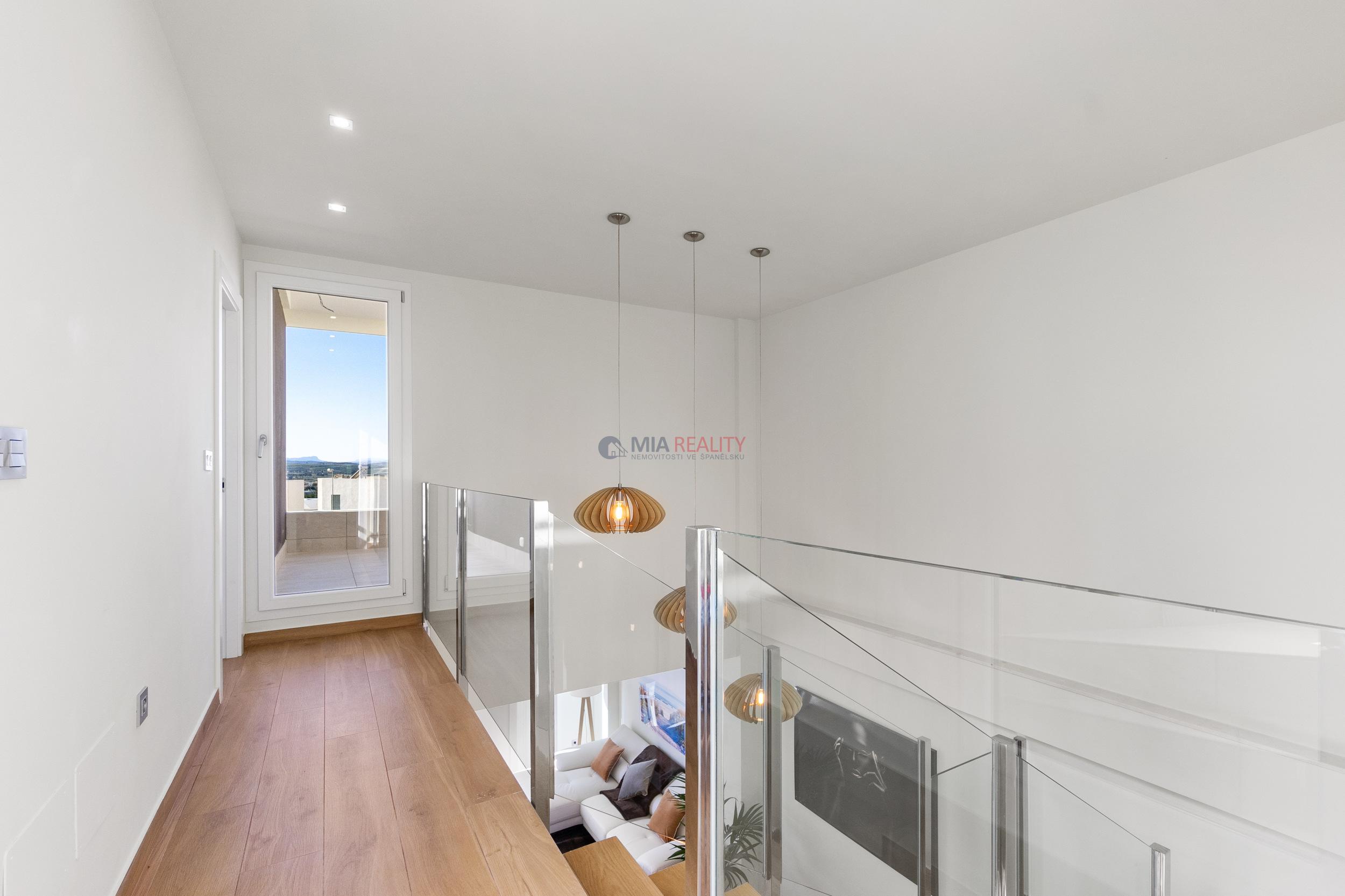 Nemovitost je rozdělena na 2 podlaží, kde jsou 3 ložnice, 4 koupelny, otevřená kuchyň a prostorné obývací a jídelní prostory, které vycházejí do úžasné soukromé zahrady. Vila je na prostorném pozemku, který zahrnuje soukromý bazén, parkování a snadno udržovatelnou zahradu. Za příplatek 16.500,- € je možné dostavět střešní terasu.
