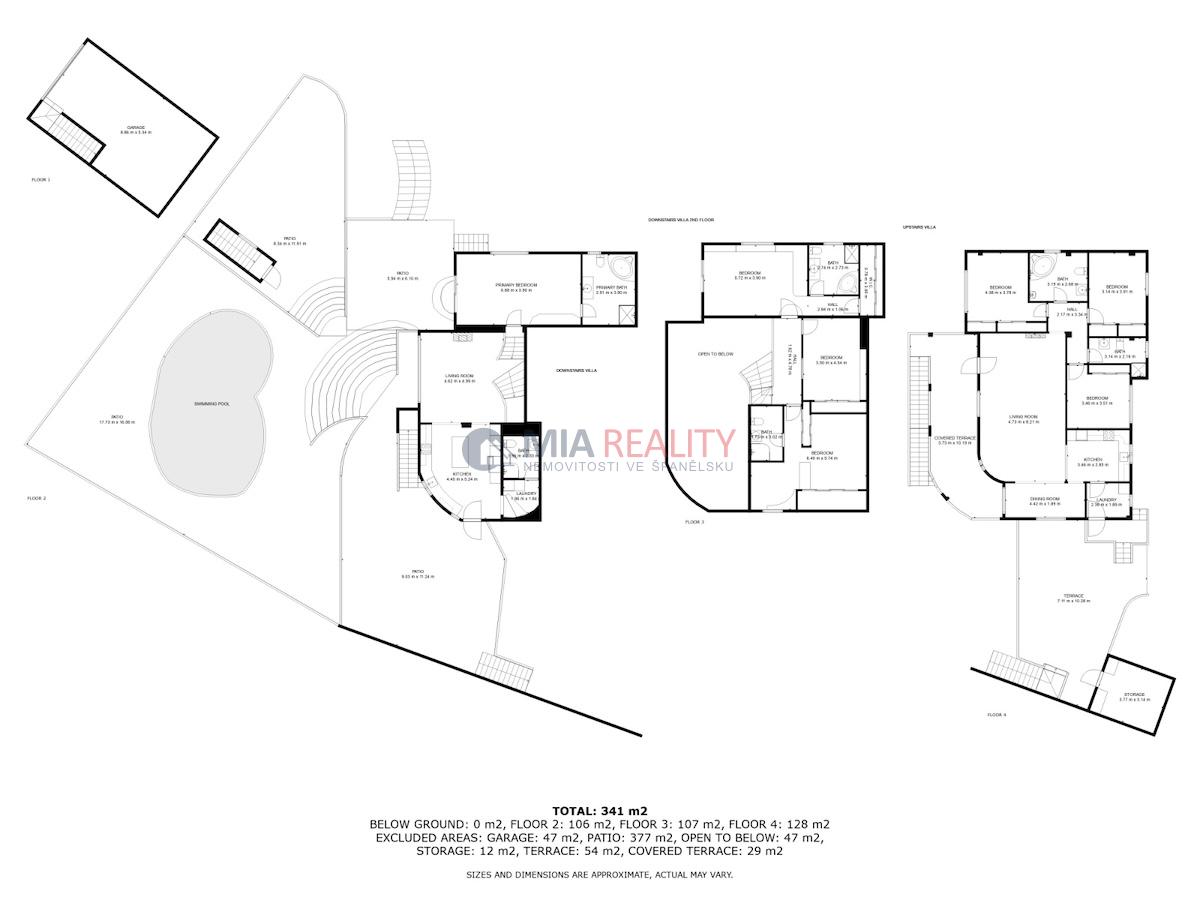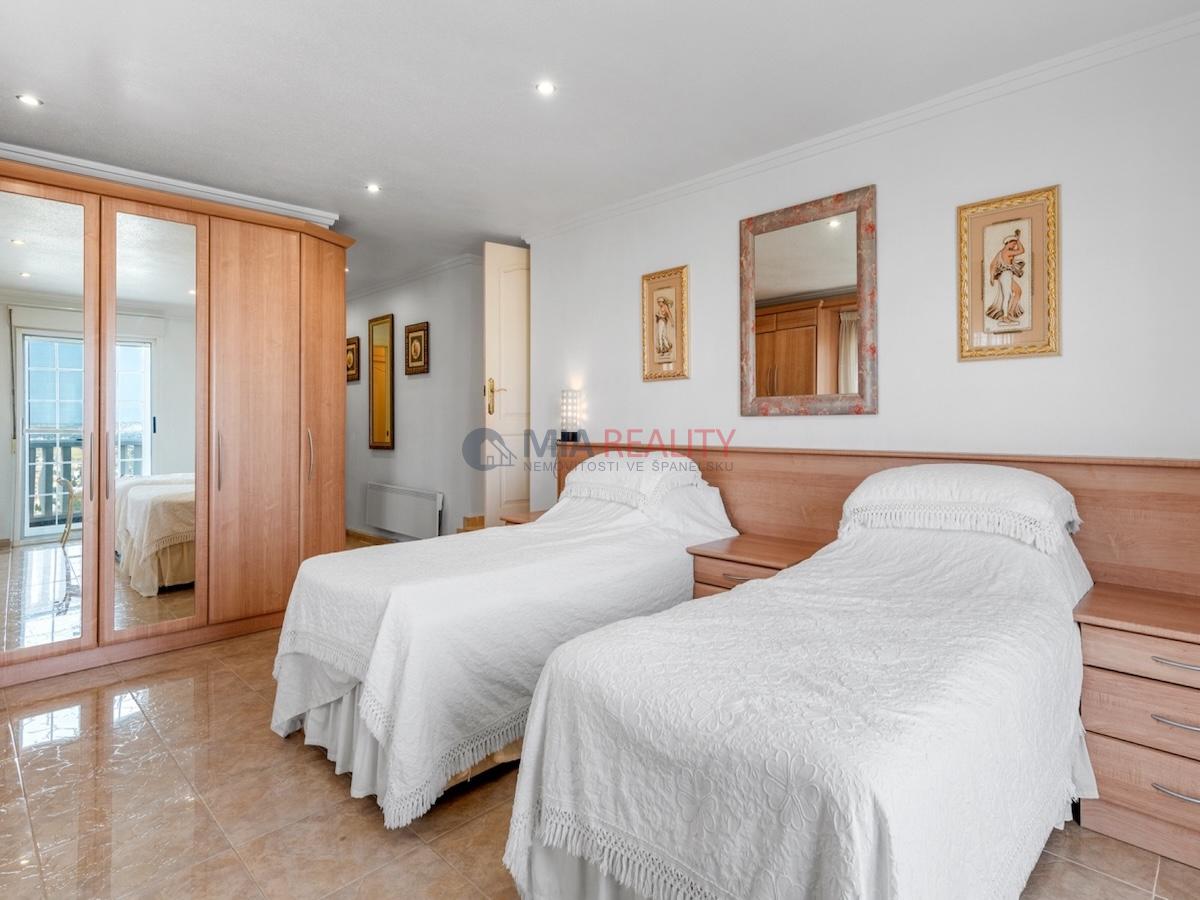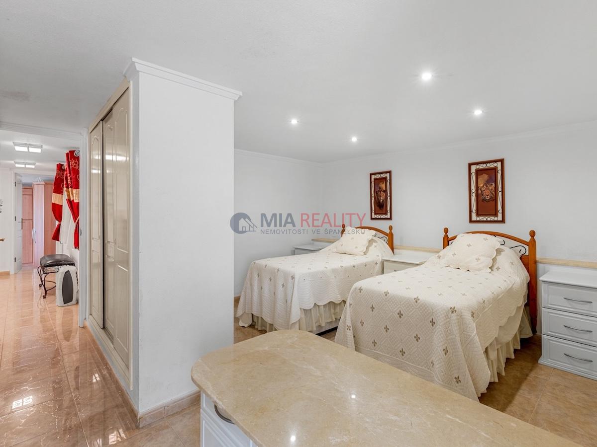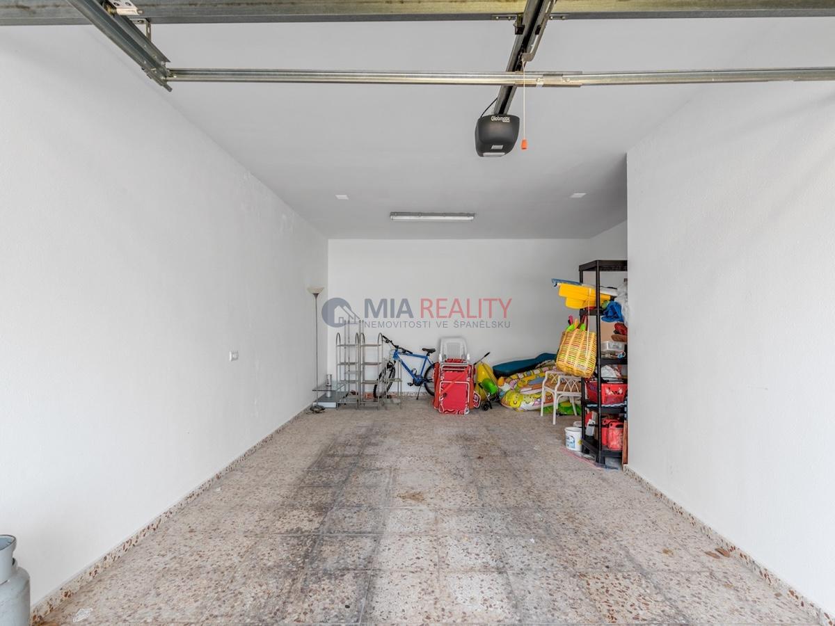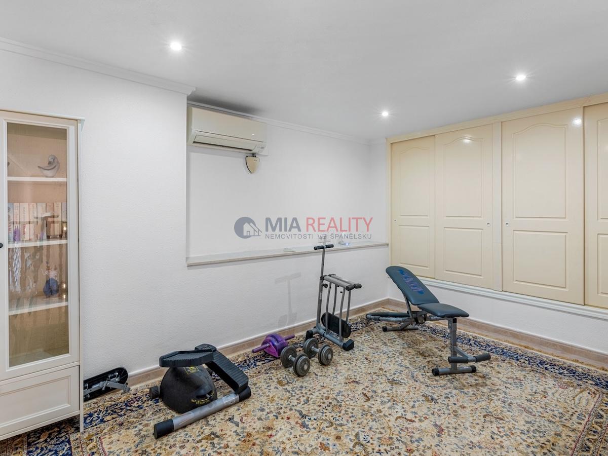Na pozemku o rozloze 1 000 m² se nachází nemovitost o rozloze 179 m² rozložená do tří podlaží. Hlavní obytná část se rozkládá na prvních dvou podlažích. V přízemí najdete světlý obývací pokoj, plně vybavenou kuchyň, prádelnu a ložnici s vlastní koupelnou. Ačkoli tato ložnice nemá přímý přístup ven, hlavní obytné prostory se mají vstup na terasy a k soukromému bazénu.
