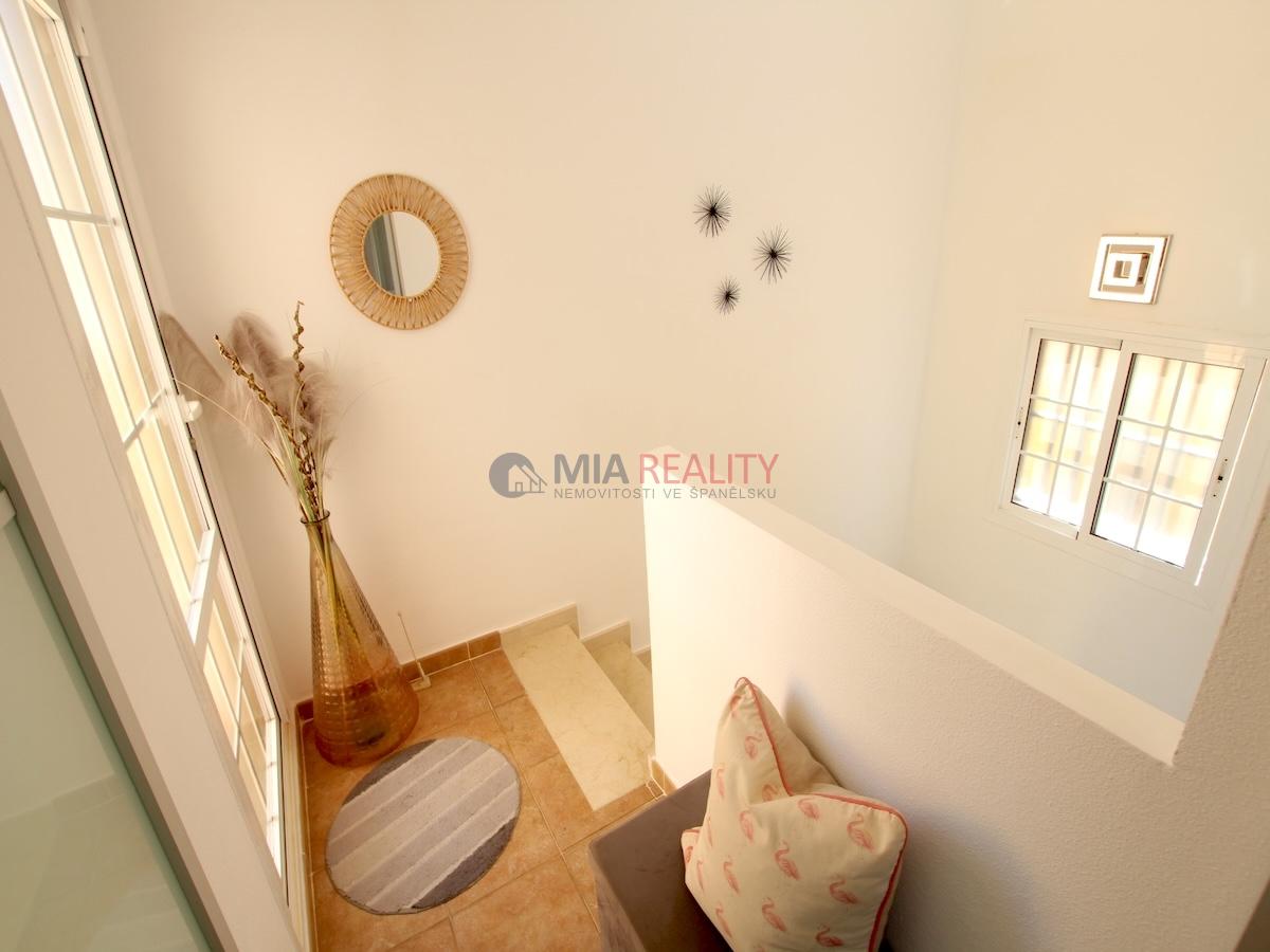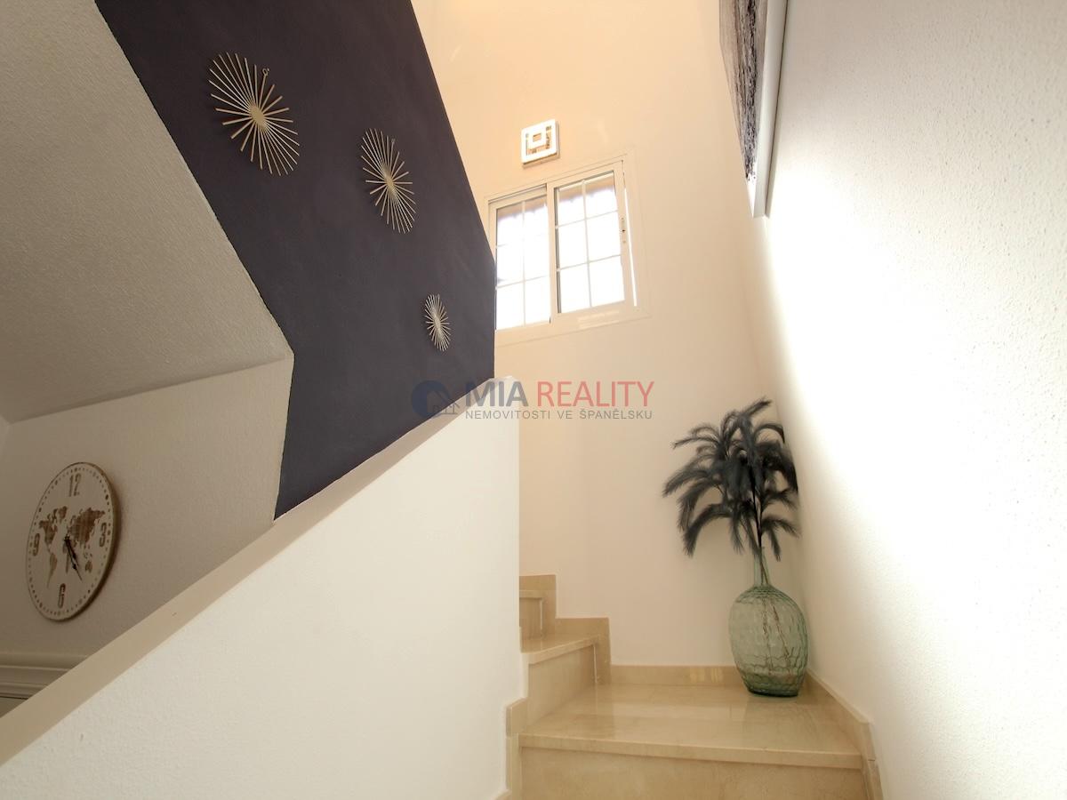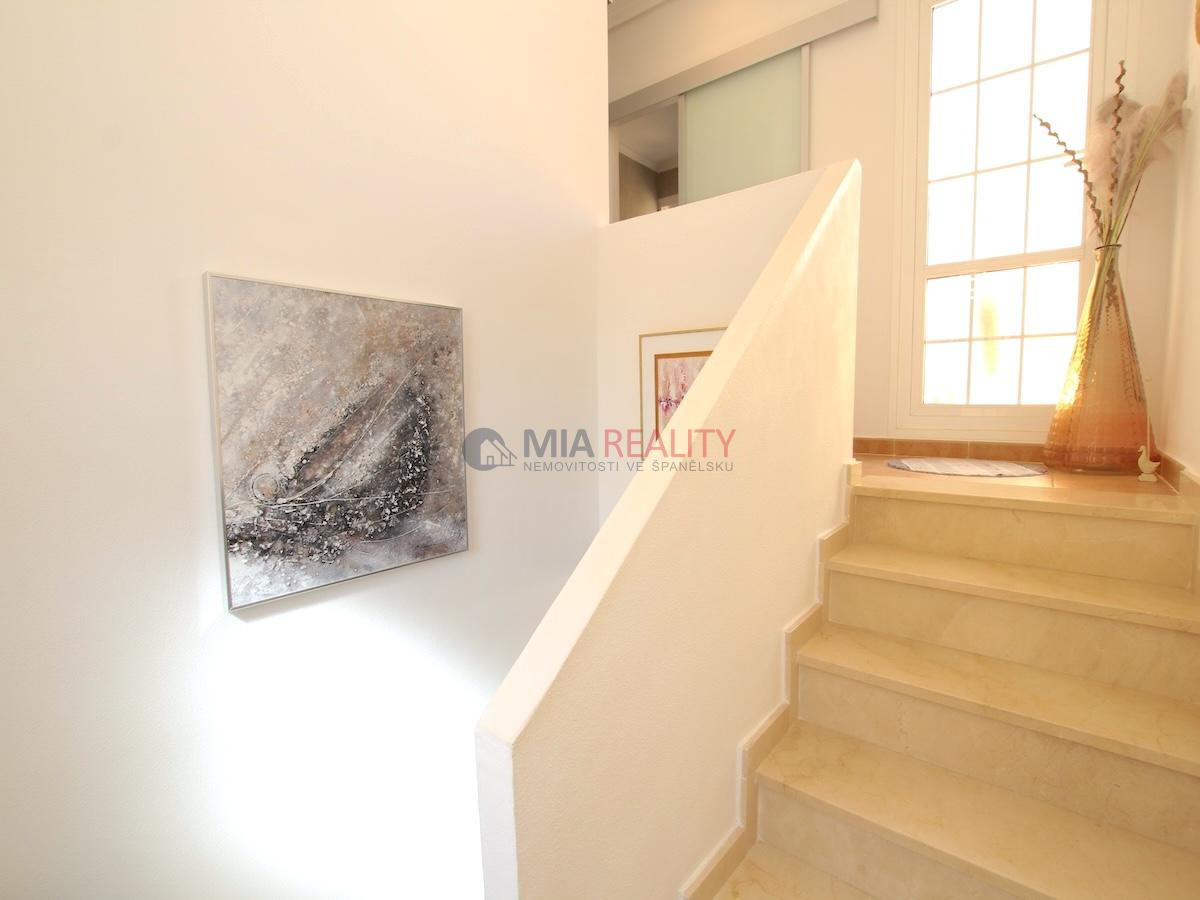 Elegantní schodiště vede do prvního patra, kde jsou další dvě dvoulůžkové ložnice s manželskou postelí, obě vybavené vestavěnými skříněmi. Hlavní ložnice má i vlastní sluneční terasu!